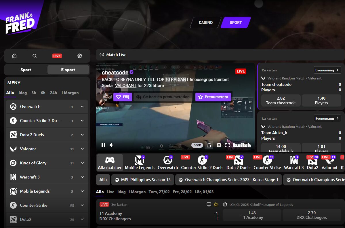 Frank & Fred är ett av de ledande spelbolagen när det gäller e-sport betting. Här kan du spela på ett brett utbud av odds från både de största e-sporterna som de mindre evenemangen. Till det erbjuder även Frank & Fred livestreaming direkt i klienten - vilket skapar en av de bästa E-sport-upplevelserna på bettingmarknaden.